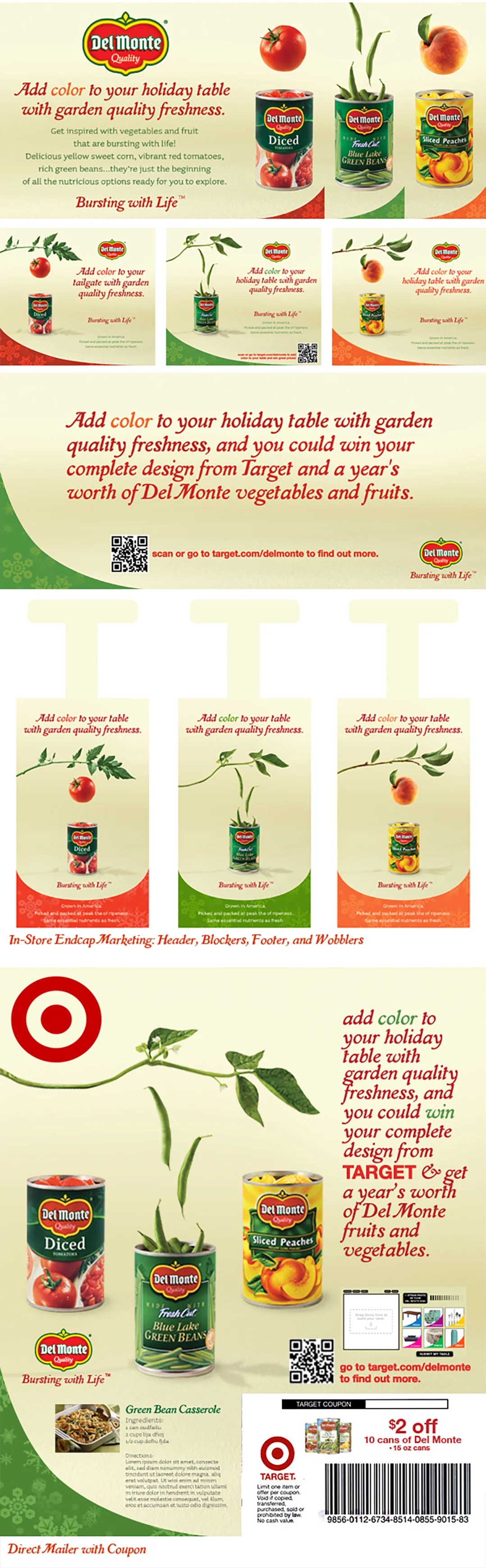 Endcap signage for Del Monte's "Bursting with Life" holiday presence in Target stores: